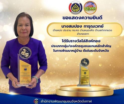 (5) นางสมปอง การุณเวทย์ ตำแหน่ง ประธานกองทุนแก้ไขปัญหาความยากจนบ้านหนองหิ้ง ตำบลท่ากกแดง อำเภอเซกา รางวัลโล่สิงห์ทอง ประเภทกลุ่ม/องค์กรชุมชนแกนหลักสำคัญในการพัฒนาหมู่บ้าน ดีเด่นระดับจังหวัด