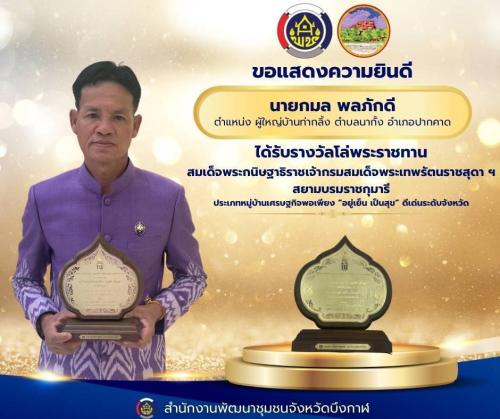 (2) นายกมล พลภักดี ตำแหน่ง ผู้ใหญ่บ้านท่ากลิ้ง ตำบลนากั้ง อำเภอปากคาด รางวัลโล่พระราชทานฯ ประเภทหมู่บ้านเศรษฐกิจพอเพียง “อยู่เย็น เป็นสุข” ดีเด่นระดับจังหวัด