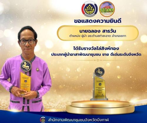 (3) นายฉลอง สารวัน ตำแหน่ง ผู้นำอาสาพัฒนาชุมชนตำบลท่าสะอาด อำเภอเซกา รางวัลโล่สิงห์ทอง ประเภทผู้นำอาสาพัฒนาชุมชน (ผู้นำ อช.) ชาย ดีเด่นระดับจังหวัด