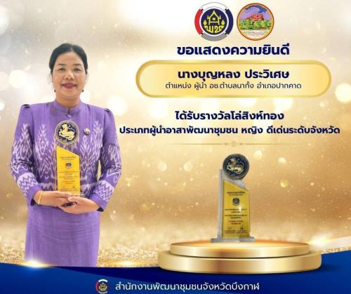 (4) นางบุญหลง ประวิเศษ ตำแหน่ง ผู้นำอาสาพัฒนาชุมชนตำบลนากั้ง อำเภอปากคาด รางวัลโล่สิงห์ทอง ประเภทผู้นำอาสาพัฒนาชุมชน (ผู้นำ อช.) หญิง ดีเด่นระดับจังหวัด