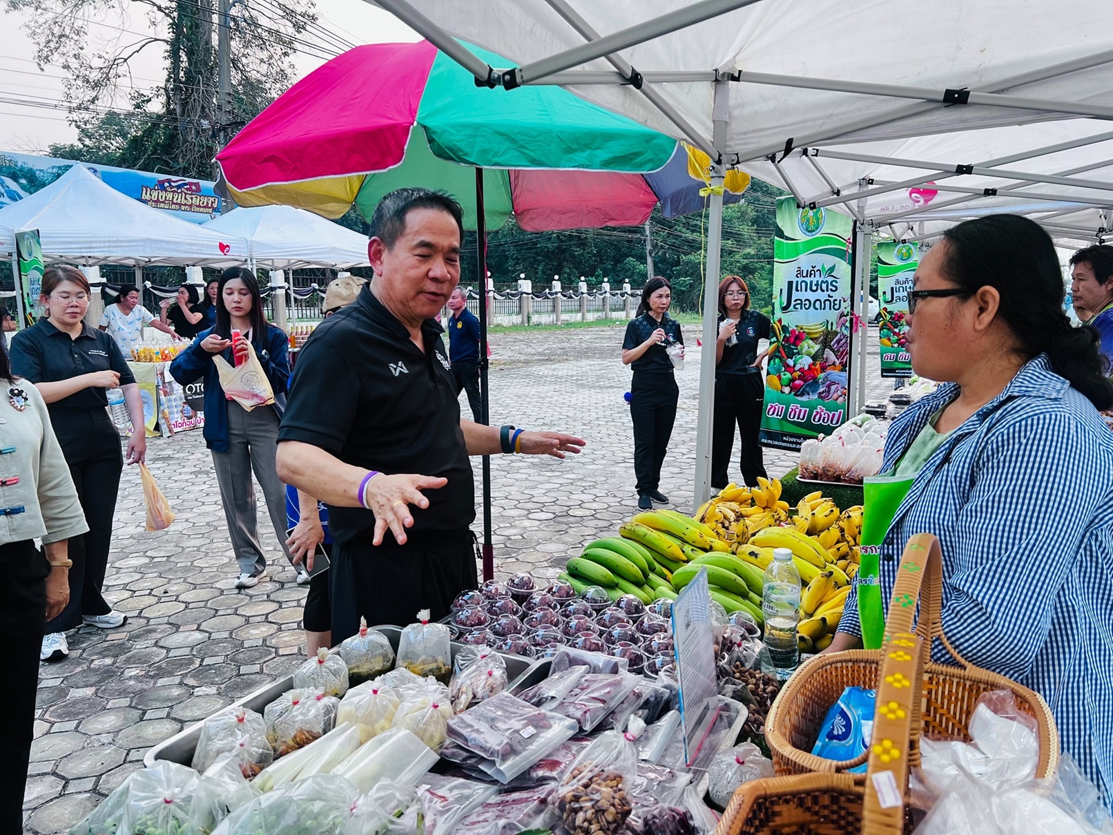 เยี่ยมชมพร้อมทั้งอุดหนุนสินค้าและพบปะผู้จัดจำหน่ายสินค้ารวมทั้งกลุ่มอาชีพสมาชิกกองทุนพัฒนาบทบาทสตรี ณ ตลาดศาลากลางสร้างสุข บริเวณลานหน้าศาลากลางจังหวัดบึงกาฬ
